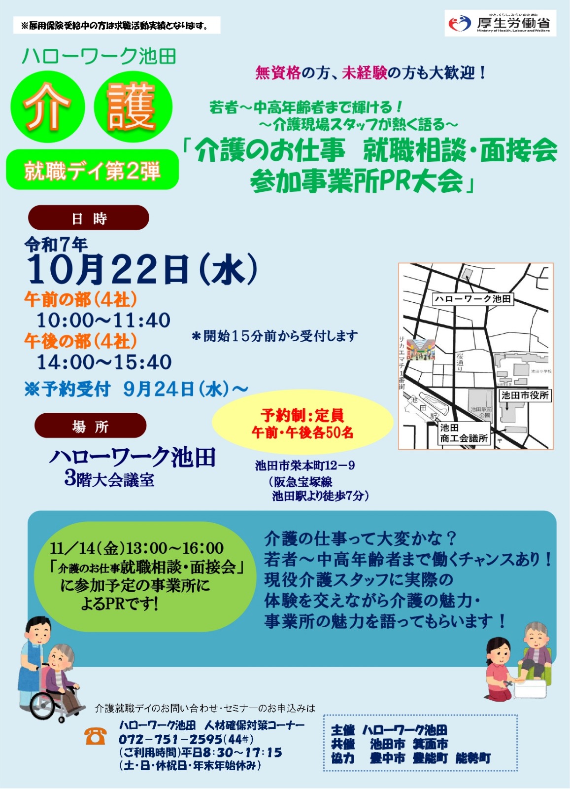 令和7年10月22日(水)ハローワーク池田3階大会議室に於きまして、「介護のお仕事就職相談・面接会 参加事業所PR大会」に出展致します。若者~中高年まで働ける職場から介護現場の職員が熱く語ります。午前の部・・・10:00~11:40午後の部・・・14:00~15:40福祉のお仕事に関心のある方のご来場を心よりお待ちしております。