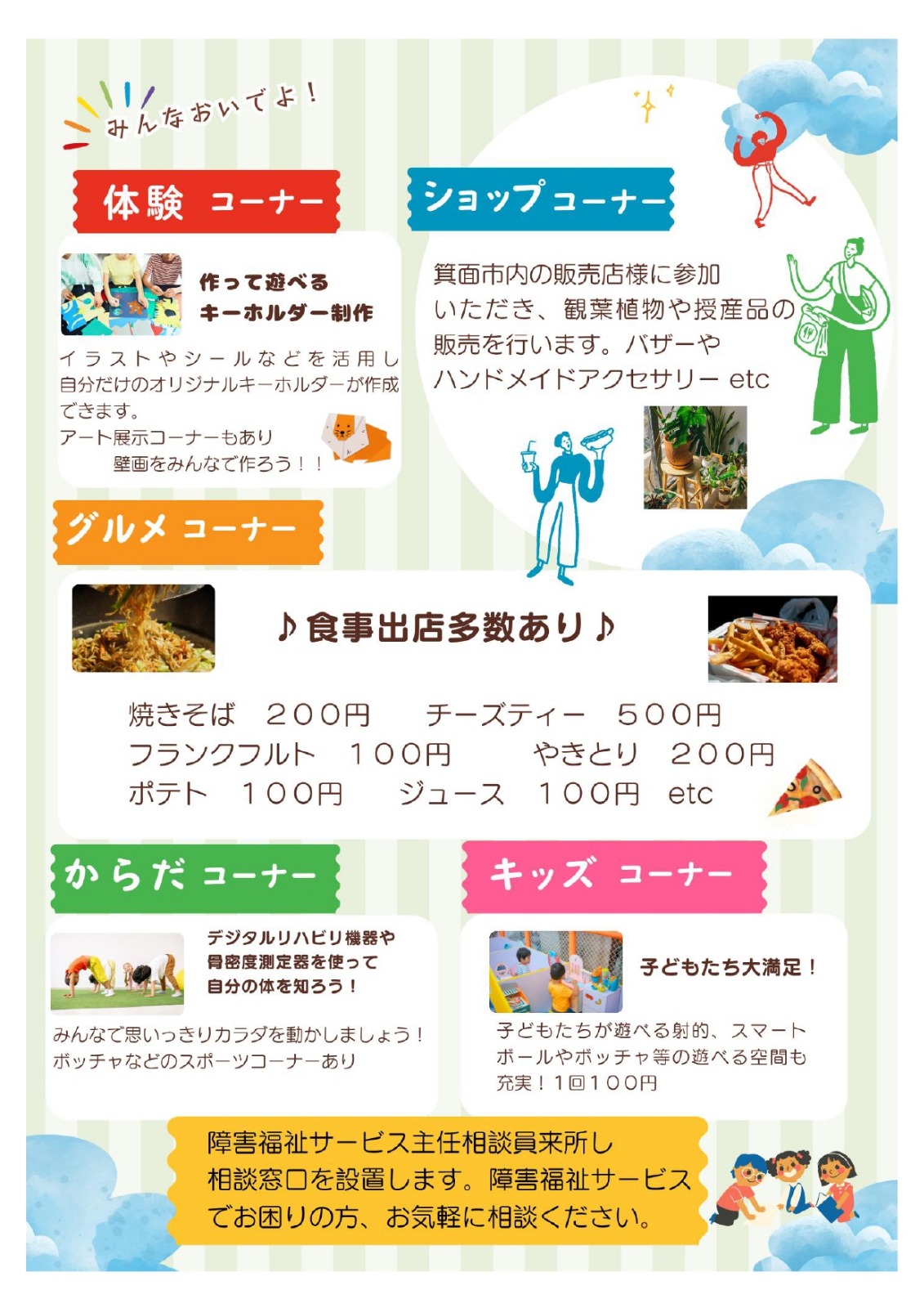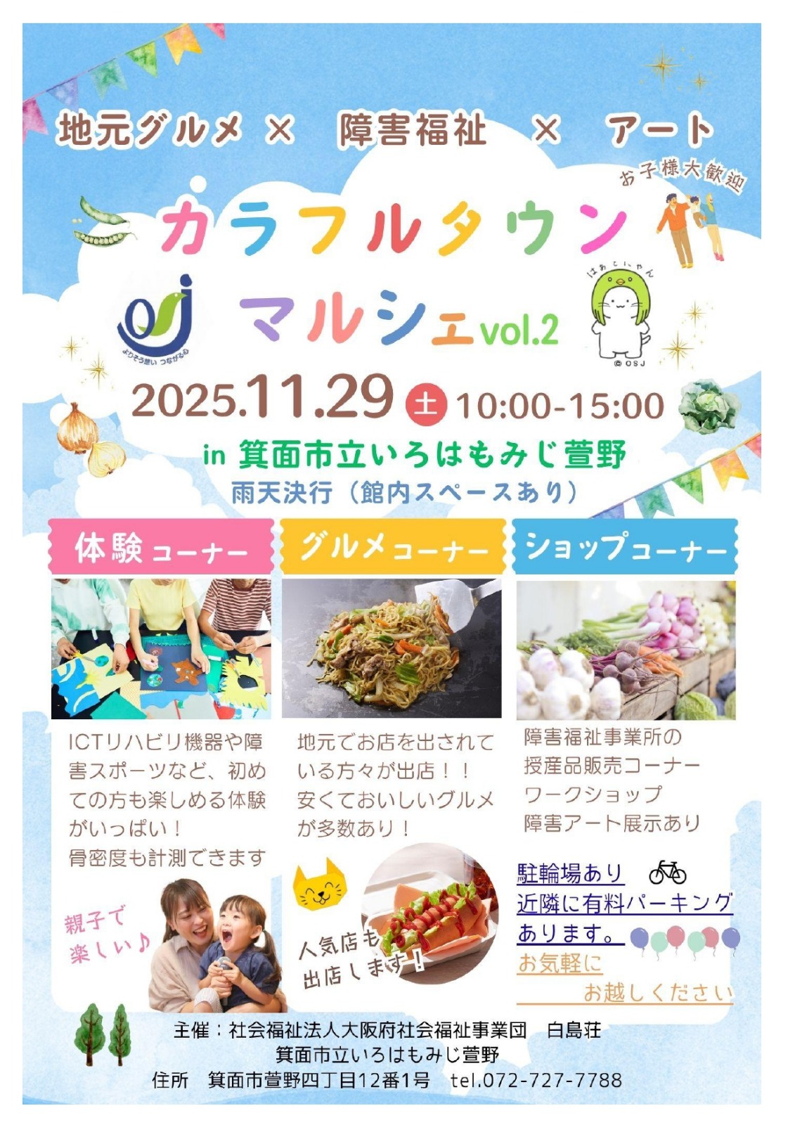 令和7年11月29日(土)10:00~15:00 箕面市立障害者自立支援センターいろはもみじ萱野にて、「カラフルタウンマルシェVol.2」を開催します!体験コーナー、グルメコーナー、事業所の授産品販売、アート作品展示など楽しさ盛りだくさんのイベントです。皆さんのご来場をお待ちしております!!