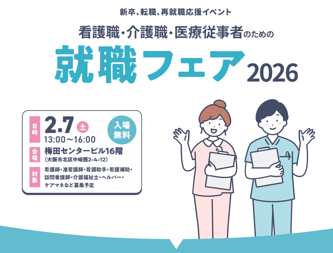 令和8年2月7日(土)13:00~16:00 梅田センタービル16階にて「看護職・介護職・医療従事者のための就職フェア2026」に出展します!
