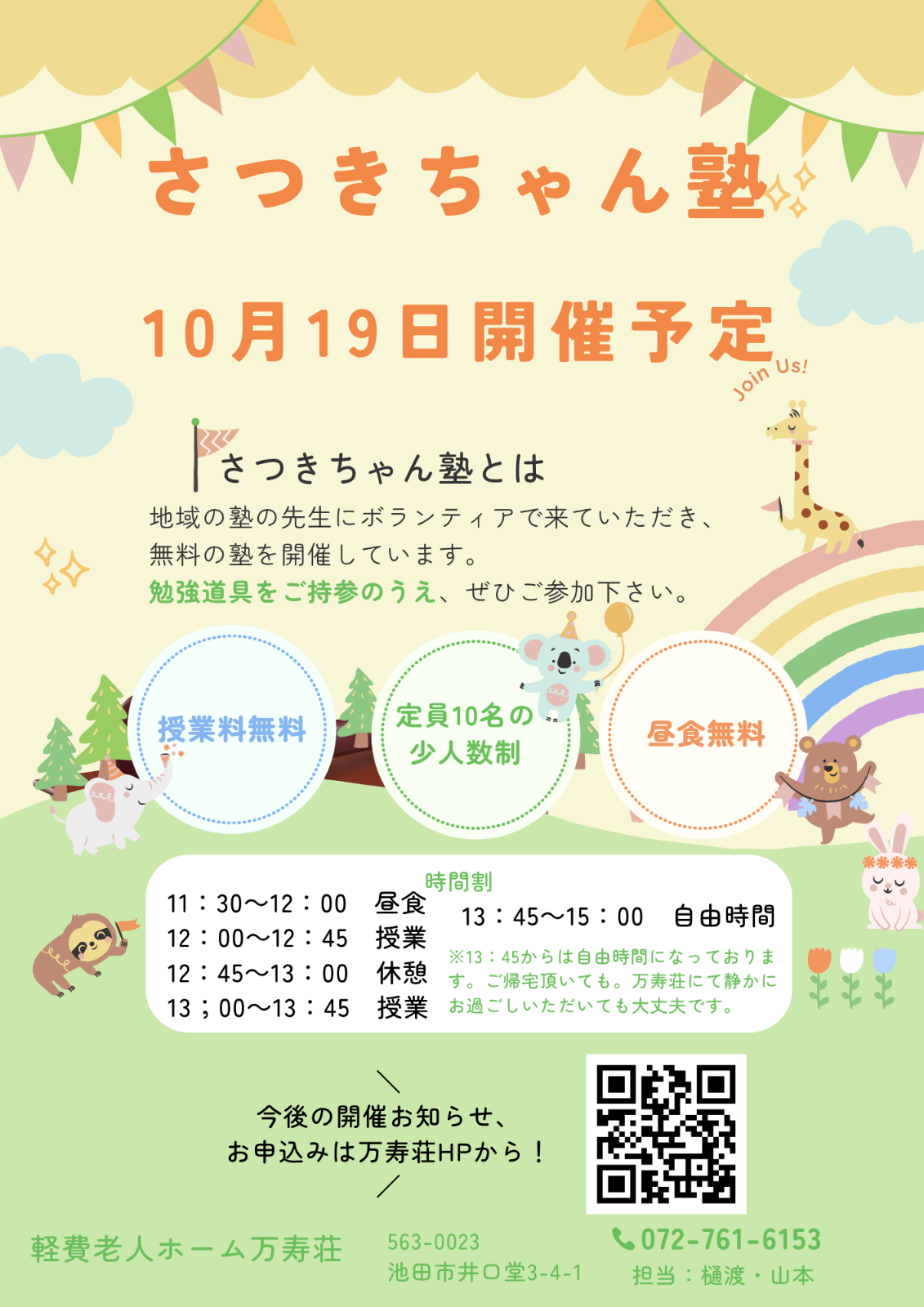 地域の小学生を対象に無料の塾を開催しています。地域の塾の先生や地域ボランティア、大阪大学ボランティアサークル「フロンティア」様にご協力いただき質の高い学習の場の提供にこだわっております。昼食も万寿荘の昼食を無料で提供しており、学習の場にプラスして子供たちの居場所も作っていけたらと考えております。