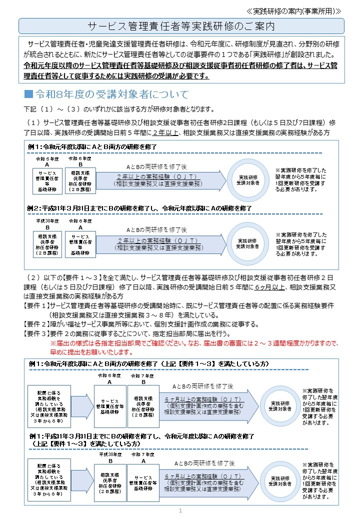 令和3年度に実践研修を受講後、令和8年度までに更新研修1回目を修了しなければ令和9年4月1日以降サービス管理責任者等として従事が出来ない方で、