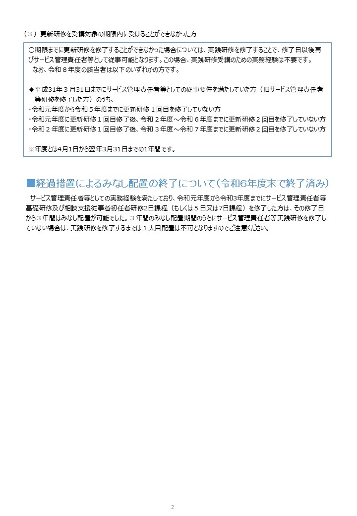 令和4年度から令和8年度までに更新研修2回目を修了しなければ令和9年4月1日以降サービス管理責任者等としての従事が出来ない方及び、